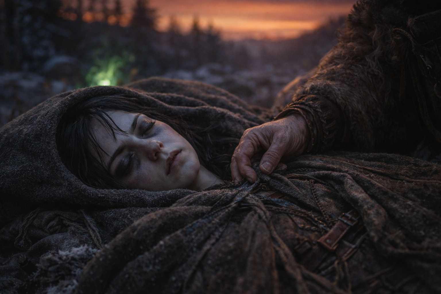 She lay where Balin had placed her, wrapped in cloaks, her breathing shallow and steady, her eyes closed, her body present and her consciousness absent. The blood on her face had been cleaned. The bruising beneath her eyes had darkened. Balin checked her pulse every fifteen minutes with the mechanical regularity of someone performing a task because the task was the only thing preventing the feeling that was waiting behind the task.