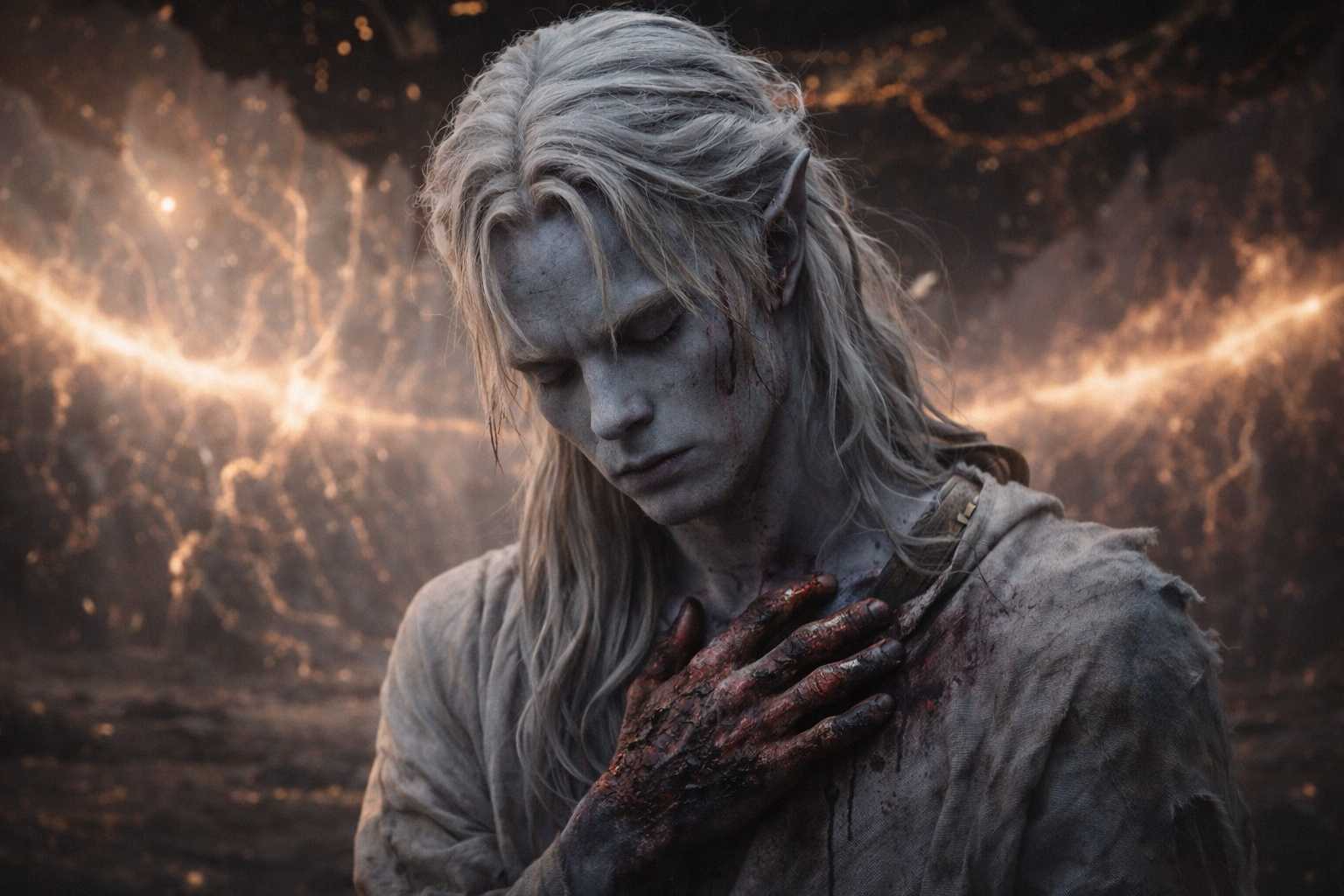 That seemed like information. His mind, which had been trained by years of cataloguing and which did not know how to stop, reached for the pattern it always reached for and began assembling the data: lungs working, shallow, the left side producing a sound on intake that suggested rib damage. Hands burned, the skin tight across both palms where the artifact’s overload had traveled through him. Nose crusted with blood that had dried in the cold. Blood in his ears, partially dried, the left ear producing a tone that might be damage or might be residual noise from the cascade. Burns along both forearms following the paths where the barrier’s energy had used his veins as circuitry.