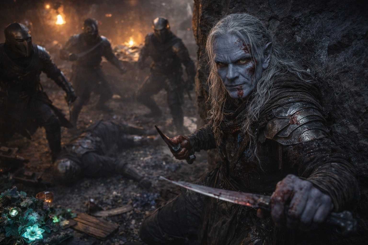 Drusniel saw the first blade fall. His father parried—barely—but the second attacker was already moving. Steel bit into his shoulder. His father staggered but didn’t fall.