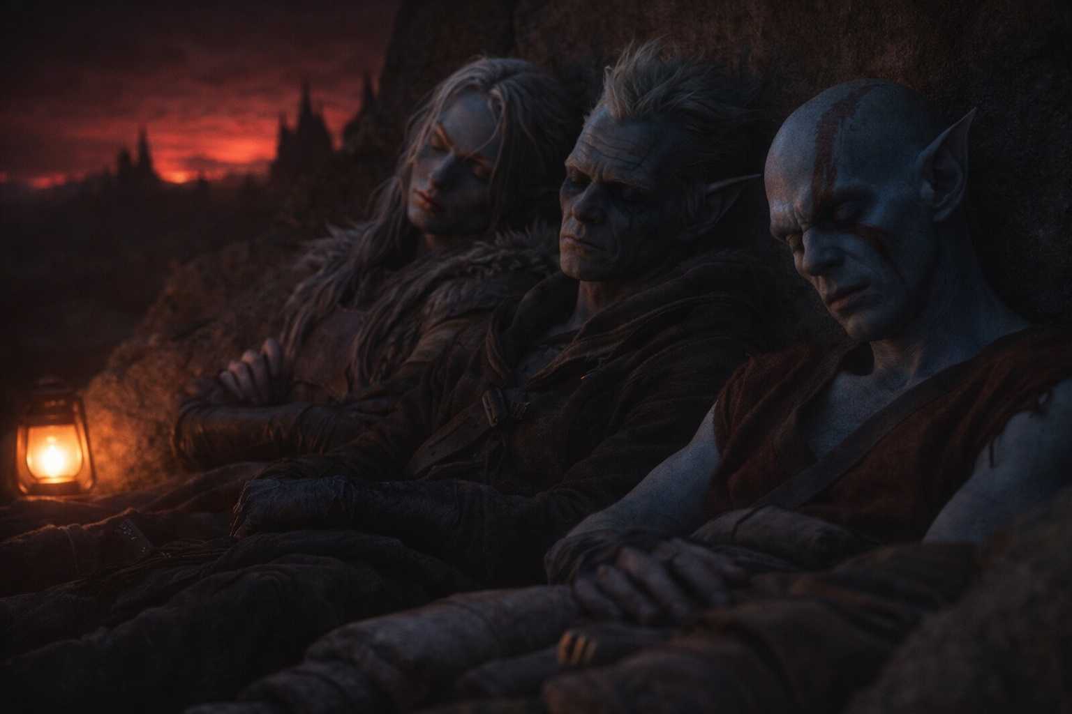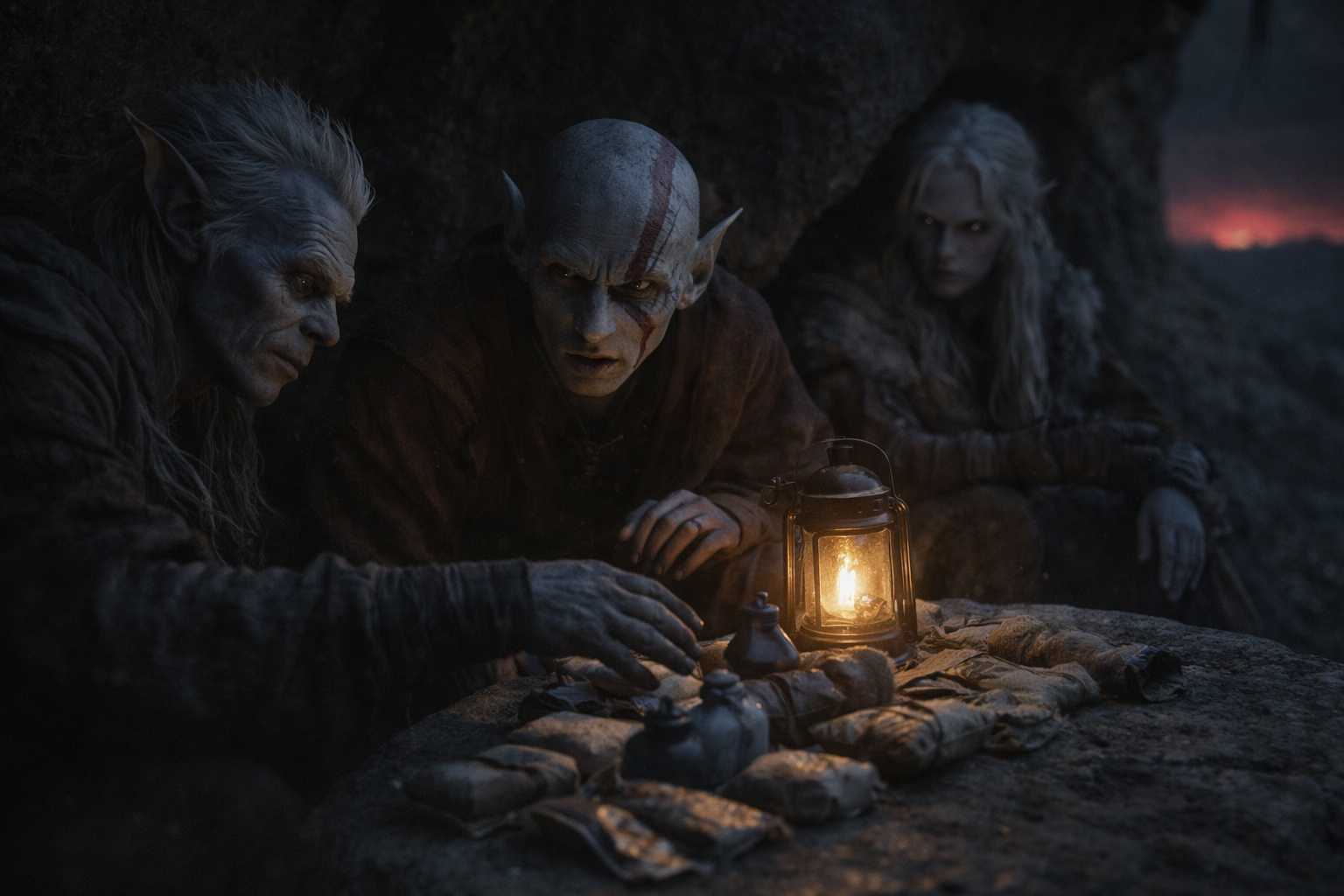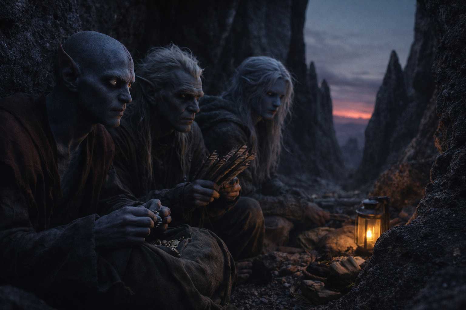They settled. Elion took position at the hollow’s mouth, a shadow watching shadows. Srietz arranged their supplies in neat rows, counting under his breath. Drusniel leaned against the warm stone and stared at the red glow on the horizon until his eyes burned.