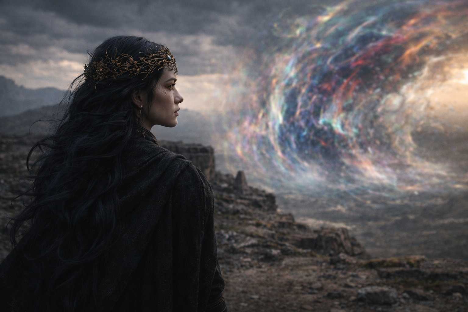 She stood at the eastern edge of their camp, human-shaped, her gold eyes fixed on the distortion that covered the sky and reached down to touch the ground where the barrier’s influence was strongest. She was not looking at Drusniel. She didn’t need to. She had been facing this direction since they’d made camp, since before they’d made camp, since the march began. Her body was still in the way that very large things are still when they choose to be, the controlled immobility of something that could move mountains deciding to stand in one place.