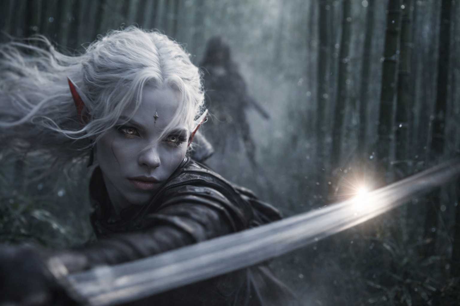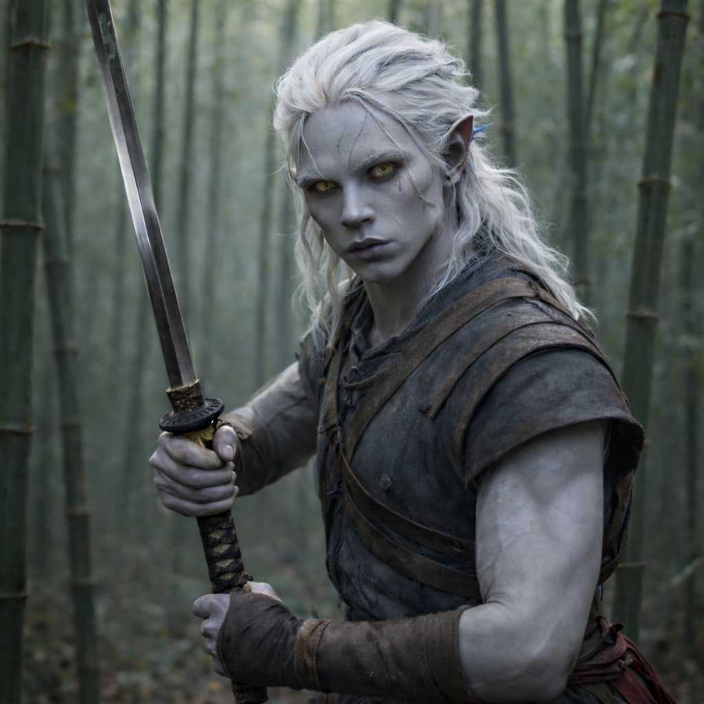 Drusniel slipped through the bamboo grove, each step placed the way his instructors had drilled into him since he could walk. His blade caught a sliver of light. Ahead, Shyntara’s pale hair marked her against the dark like a challenge.
