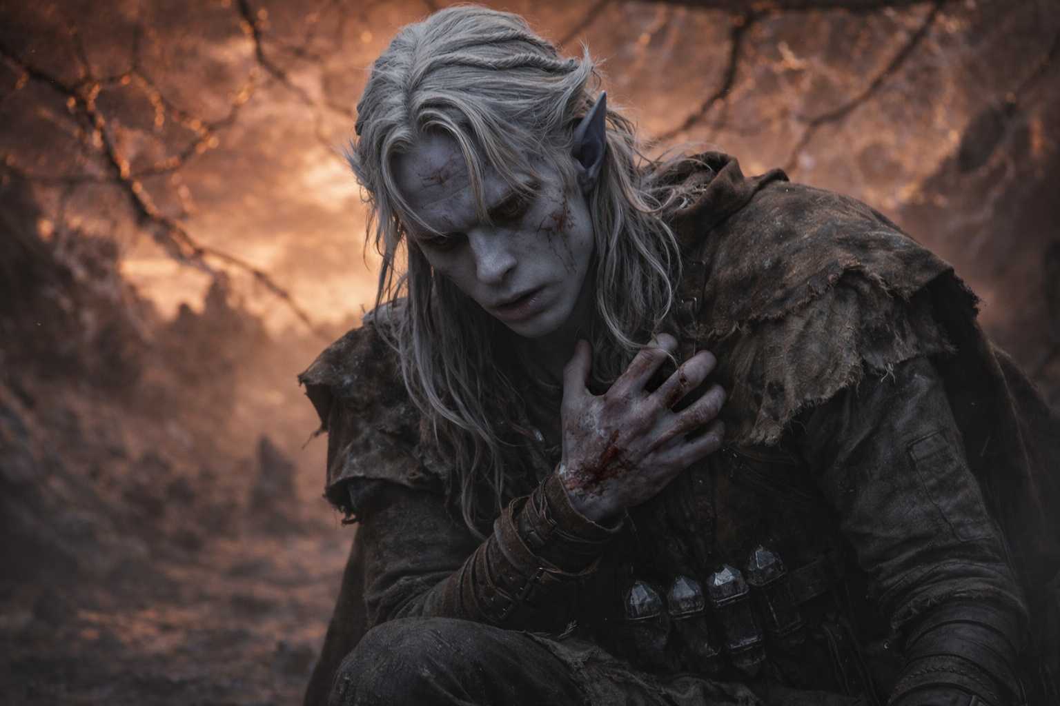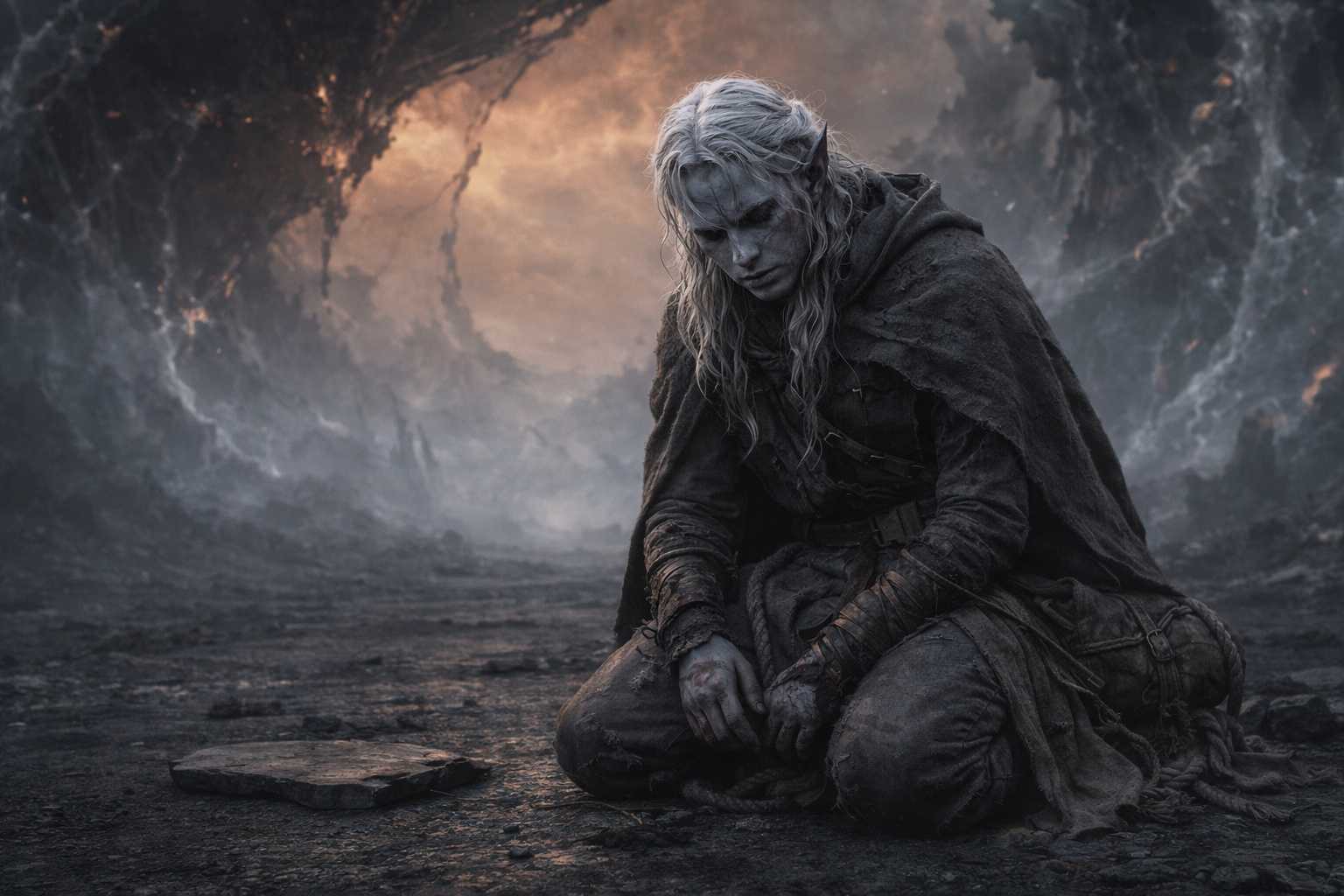 Not literal ash. The residue of what the barrier’s interior had been before the breach. The pulsing floor was still. The energy veins were dark. The dome overhead was cracked, the amber-rust sky of the changed world visible through the fractures like wounds in a ceiling that would never heal. The air carried the contamination, the entity’s presence distributed through the atmosphere as a permanent condition, and Drusniel breathed it because his adapted lungs still worked even if nothing else did.