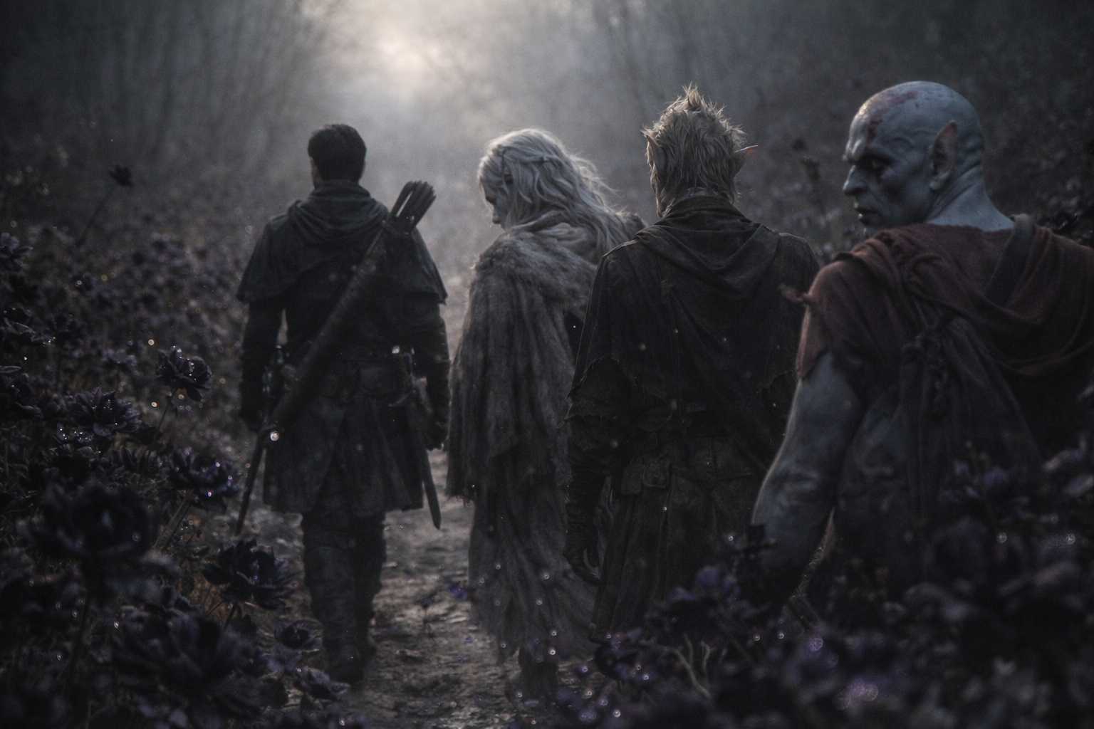 They packed in silence and followed Talryn out of the flower-woven structure into a morning that smelled like chemicals and looked like a painting done in shades of black and violet. The flower field stretched in every direction, endless rows of cultivated darkness, and the path Talryn chose cut through it with the certainty of someone who’d walked it a thousand times.