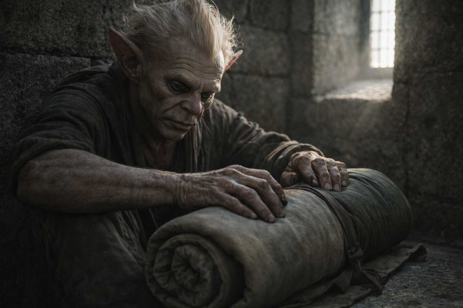 He’d moved his bedroll to the far wall during the night, as far from Drusniel as the room allowed, and now he rolled it with the efficient precision of someone who’d learned, in years of captivity and flight, that a tight bedroll was the difference between fitting your pack through a narrow gap and dying on the wrong side of it. His hands worked. His ears were flat. His yellow eyes tracked his own fingers and nothing else.