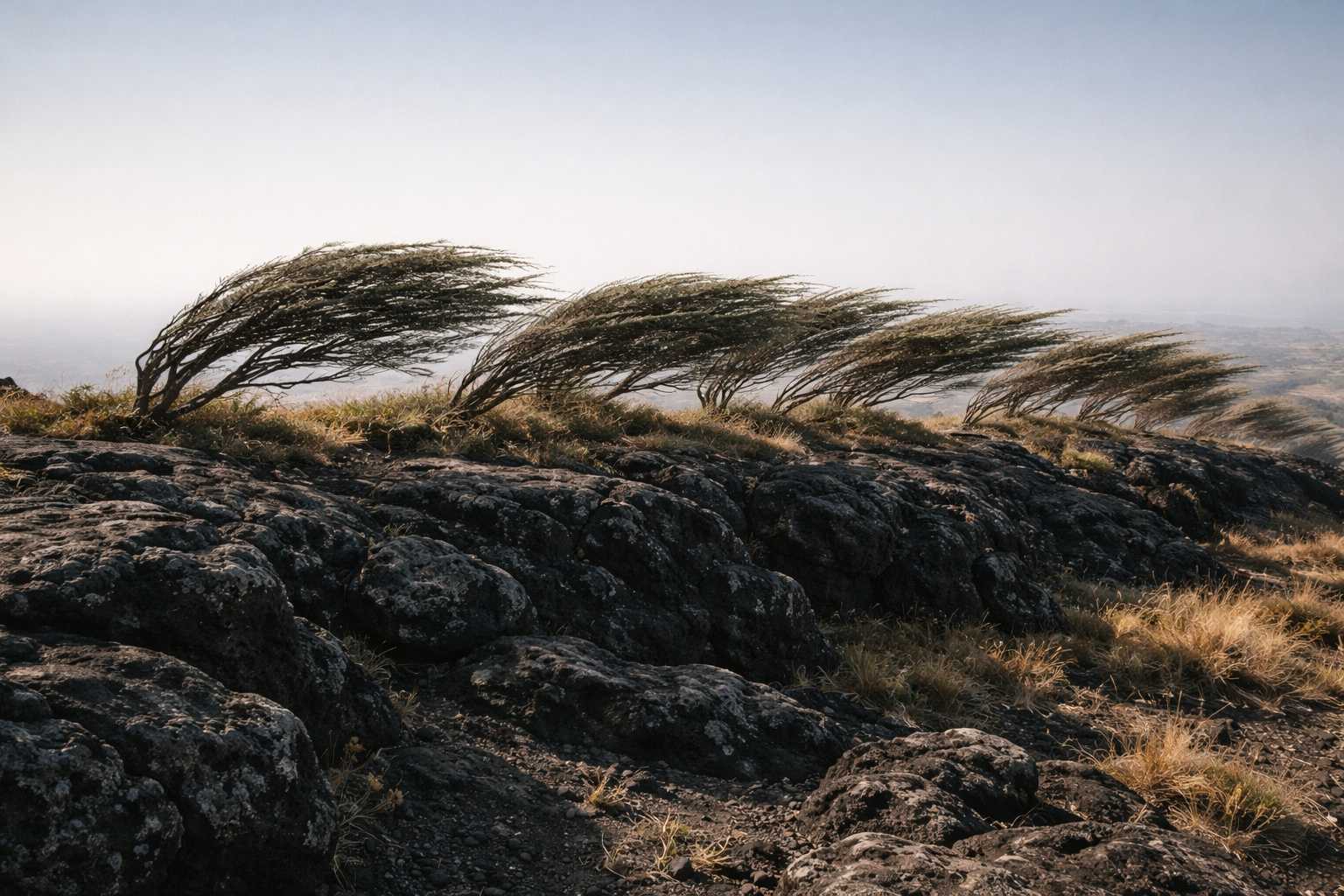 The pressure rolled over the landscape the way a wave rolls over sand: not crashing but inexorable, flattening the ambient noise, compressing the space between each sound until the silence between footsteps felt deliberate. The twisted shrubs along the ridge bent east, away from the source, as if the air itself was being pushed ahead of something large.