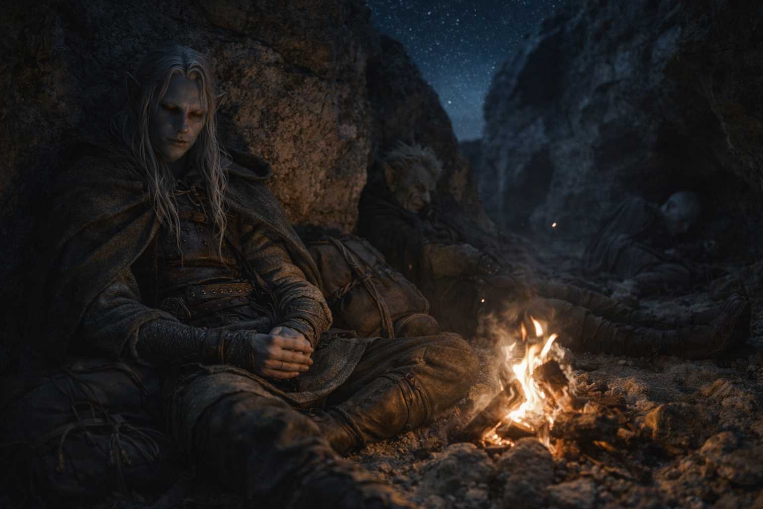 The fire burned low. The wind moved through the rock formation with a sound like breathing. Srietz slept against the far wall, close enough to help, far enough to hurt. Elion’s stillness held its usual ambiguity. The landscape of Wyrmreach extended in every direction, hostile and wrong and the only direction forward.