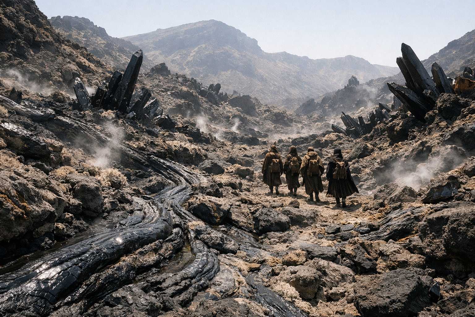 They walked. The terrain climbed. The wild crystal formations became more frequent, their geometry more complex, veins of black mineral threaded through the rock in patterns that suggested circulation rather than deposit. The landscape had a pulse here. Not literal. Not quite metaphorical. A rhythm in the way the ground shifted temperature, the way the light bent around certain formations, the way the air tasted of metal and distance.