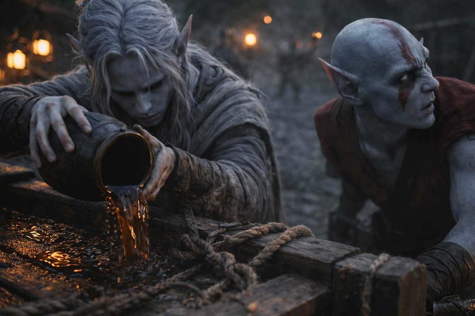 They reached the wagon together. Drusniel found the oil containers while Elion kept watch, his head swiveling in ways that human necks couldn’t manage. The guards were still at the perimeter, still focused outward. They had seconds.