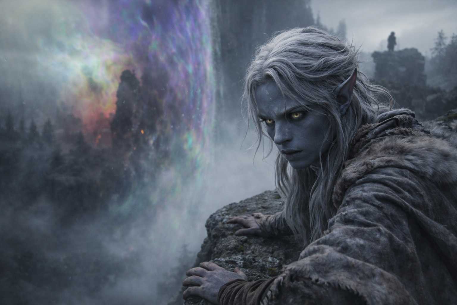 Drusniel stood at the cliff’s edge, staring at something his eyes couldn’t quite process. The air ahead was wrong—thicker, somehow, like looking through dirty glass smeared with oil. Colors shifted at the boundary. Blue became purple. Green became something that had no name. Sound faded to nothing and then returned changed, deeper, echoing from directions that shouldn’t exist.