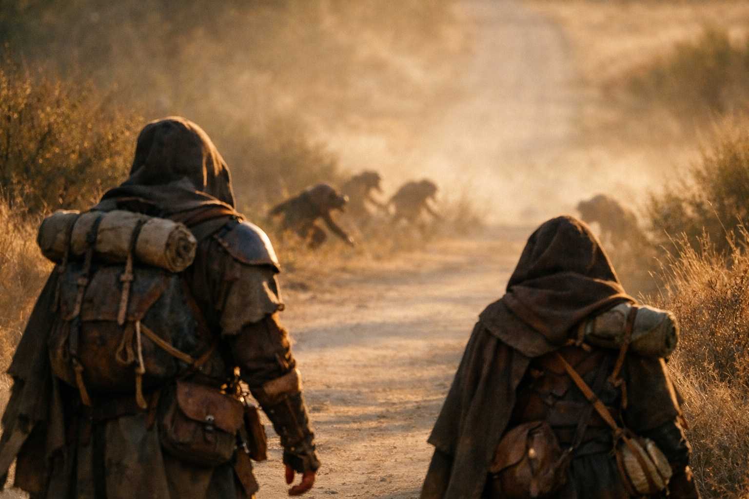 The road behind them wasn’t empty anymore. Figures—three, maybe four—had crested the rise. They moved with a fluidity that was entirely wrong for travelers. No wasted motion. No conversation. They flowed over the terrain, silent and inexorable.