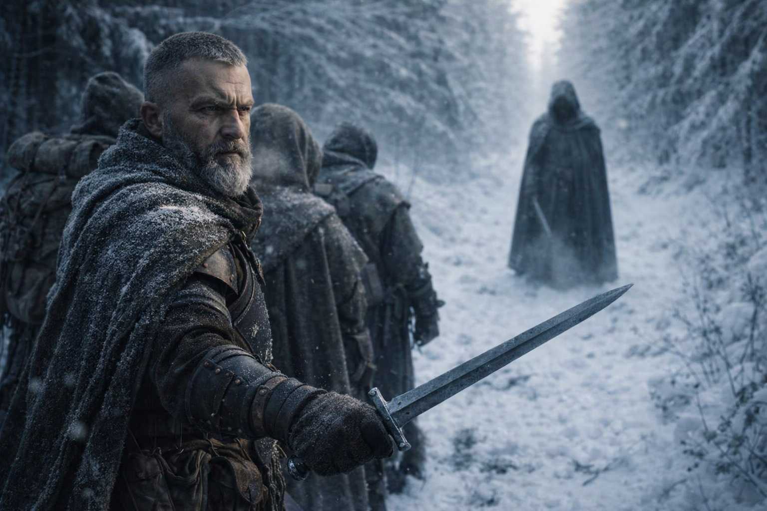 The lead figure on the trail ahead raised one hand, palm out. Not a surrender. A pause. He was tall, human, wearing the same grey cloak as the others, and when he spoke his voice carried the calm of someone conducting business.