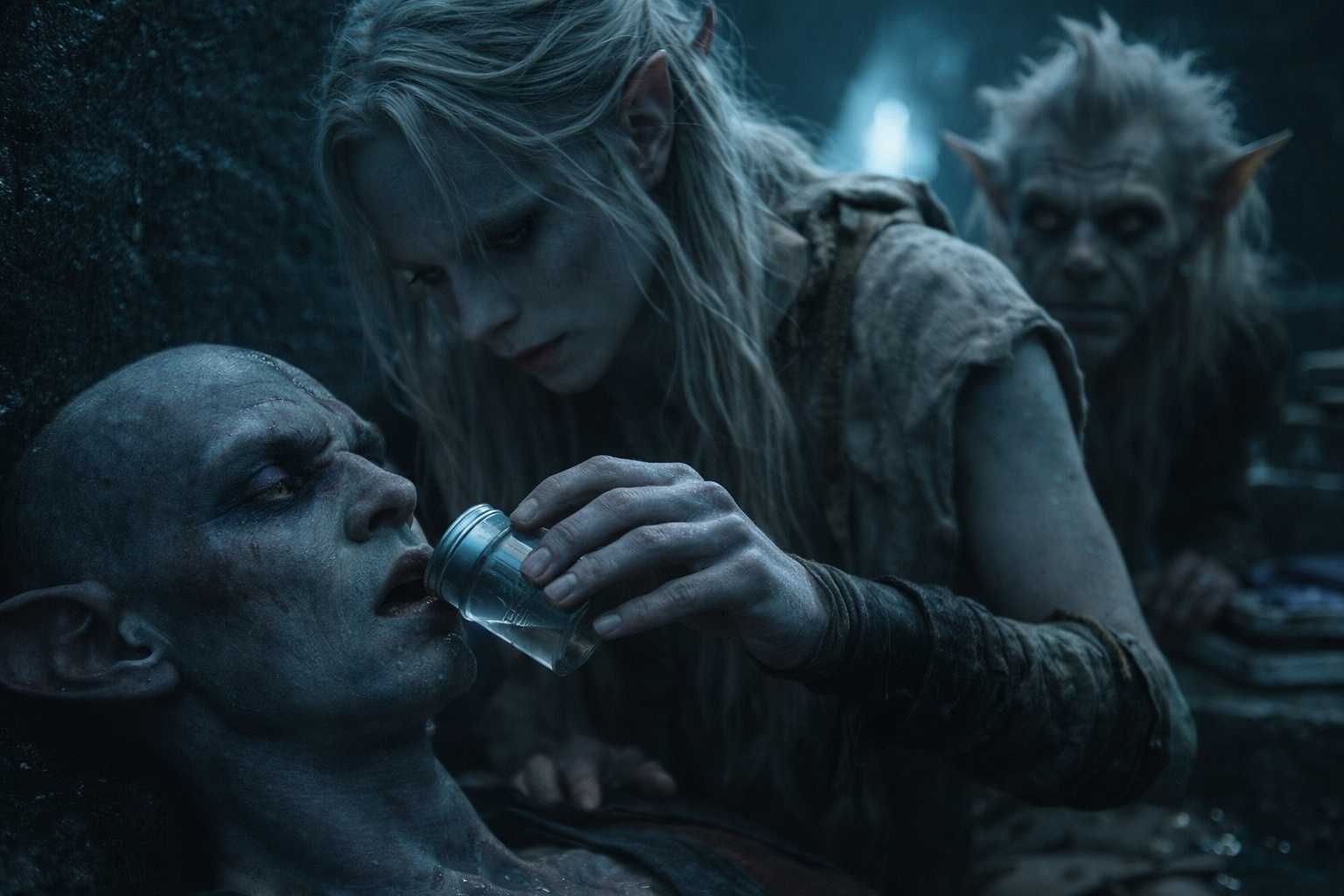 Srietz was already moving, returning moments later with a makeshift container of collected moisture. Drusniel held it to Elion’s lips, forcing small sips past the shapeshifter’s barely-responsive mouth.