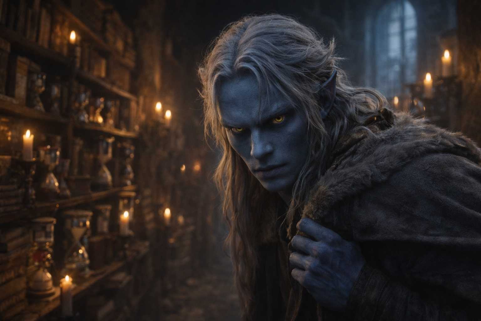A drow stood at the top of a spiral staircase. Tall, gaunt, with white hair that hung past his shoulders. His robes were dark and simple. His eyes caught the candlelight and reflected it back—violet, shifting toward silver as he descended.