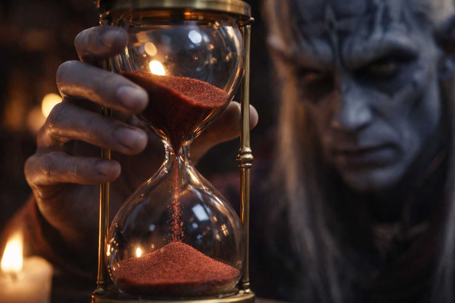 An hourglass on the nearest shelf ran out. The last grains of red sand fell into the lower chamber, and for a moment, the silence in the room felt absolute.